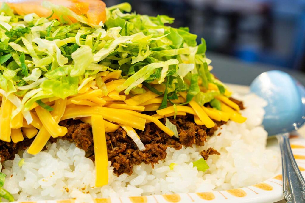 見た目はメキシコ料理のタコスに似ていますが、トルティーヤの代わりにごはんを使うのが特徴です。辛みと酸味、チーズのコク、そしてごはんのやさしい味わいが絶妙に混ざり合い、子どもから大人まで幅広く親しまれています。