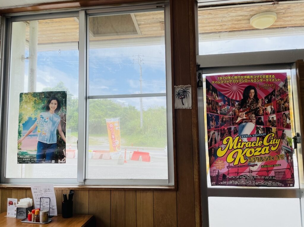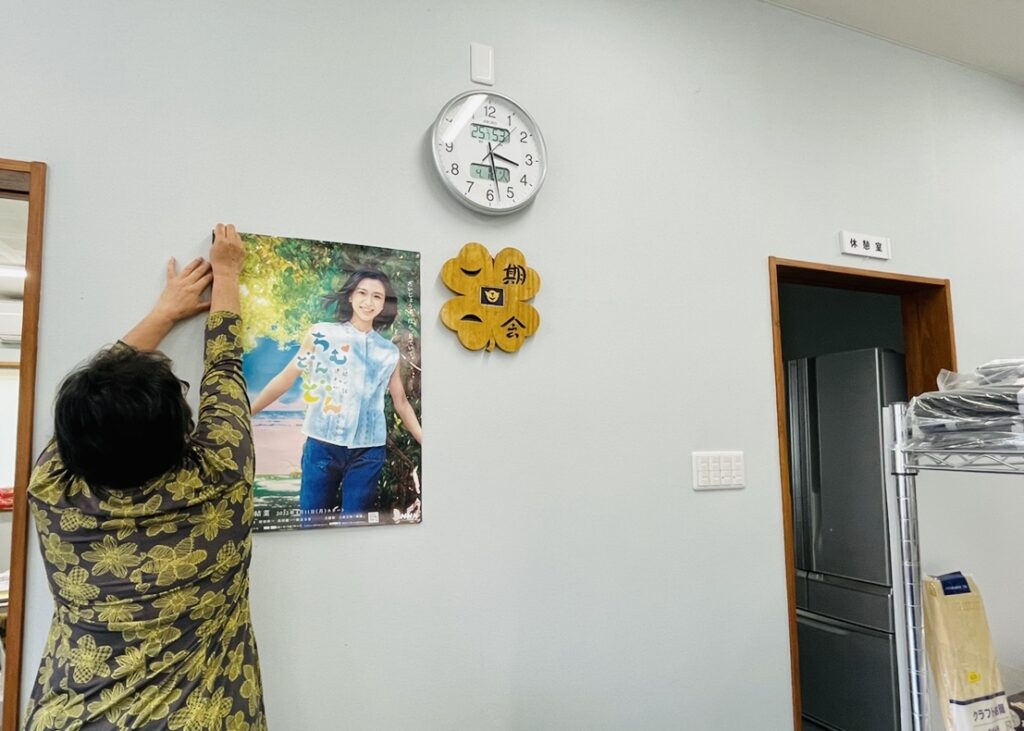 やんばるチームどんどん協議会で奥間会長と喜久山事務局長がもらってきたポスター、町内の店舗に協力して掲示してもらっているタム~