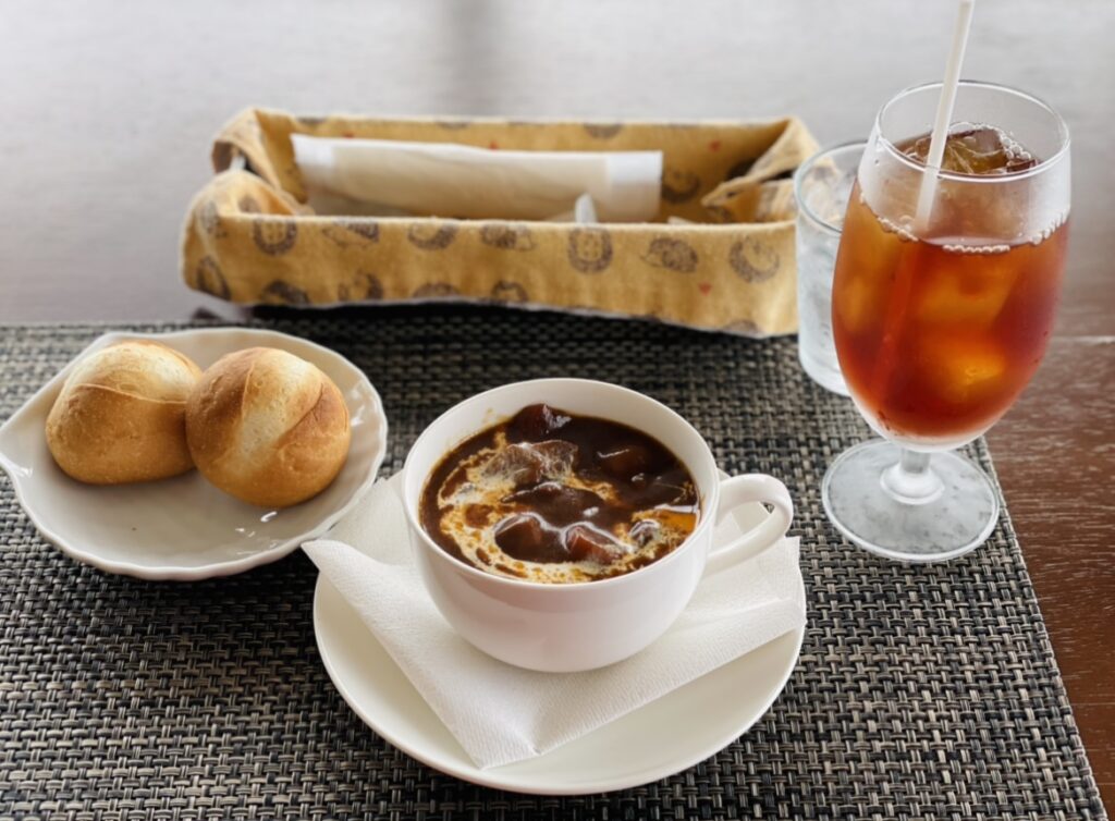 レストランの大きな窓からは金武町の美しい景色がパノラマで広がり、食事とともに眺めも存分に楽しむことができます。