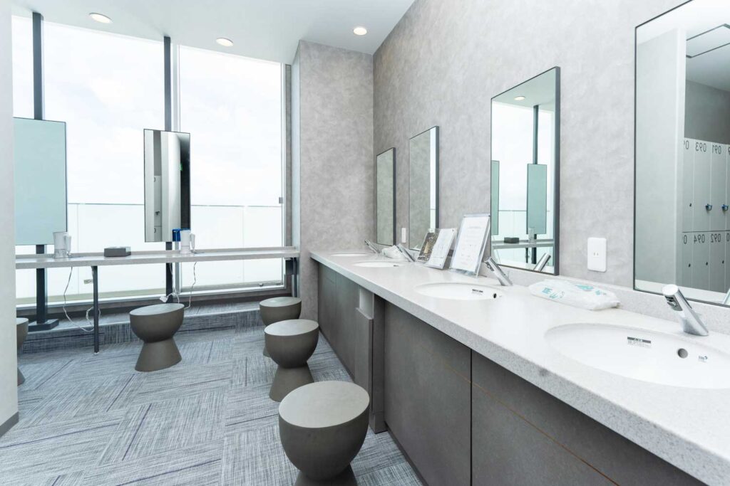 ロッカールームや脱衣所、パウダールームはどれも広めの作りになっていて、窮屈さを感じさせません。