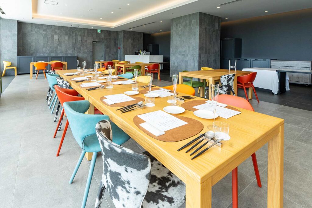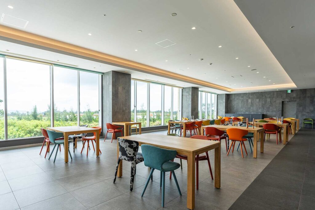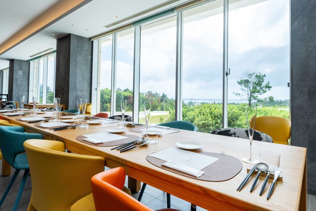 レストランの大きな窓からは金武町の美しい景色がパノラマで広がり、食事とともに眺めも存分に楽しむことができます。