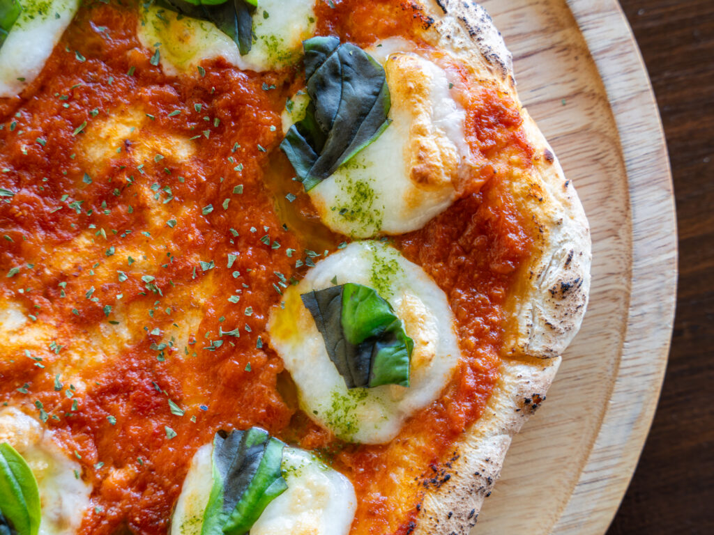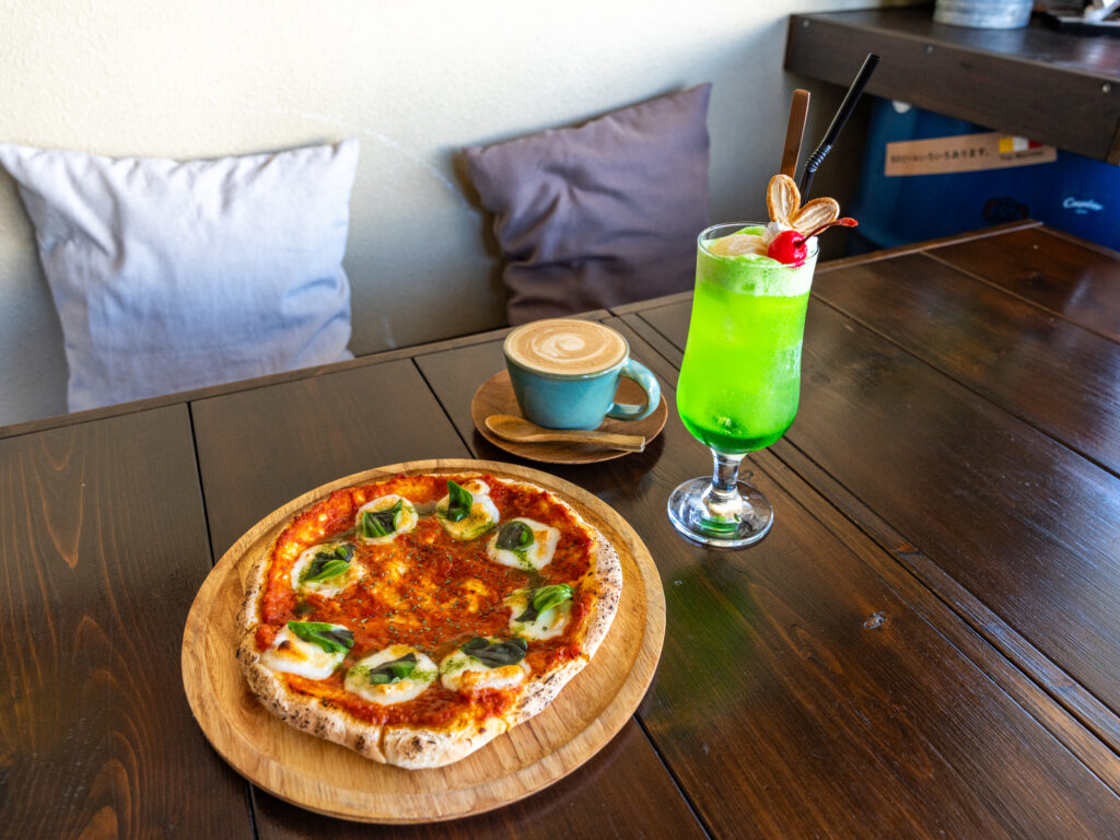 焼きたての香ばしいピザは、カフェバルJUNKYの人気メニューのひとつ。